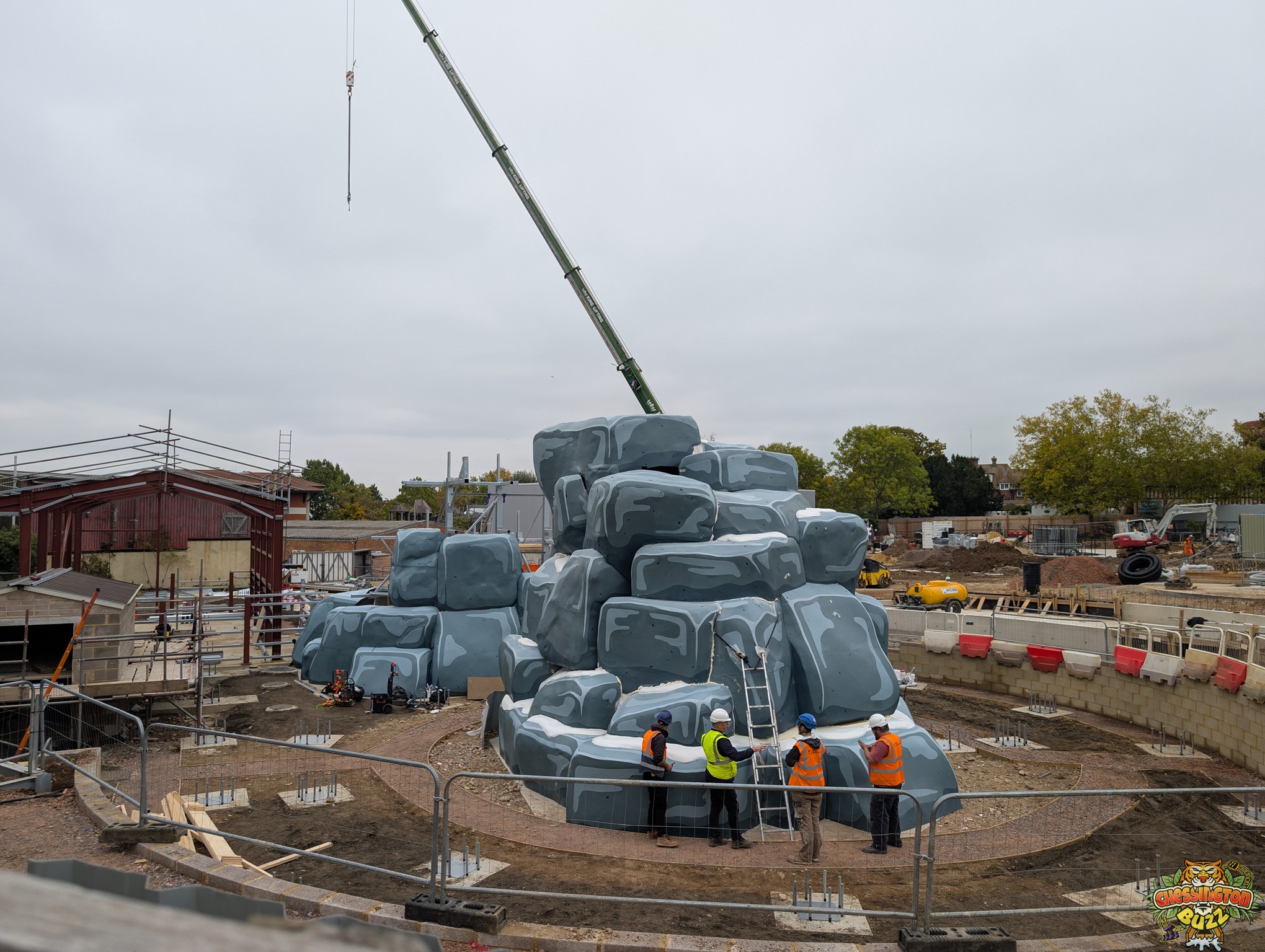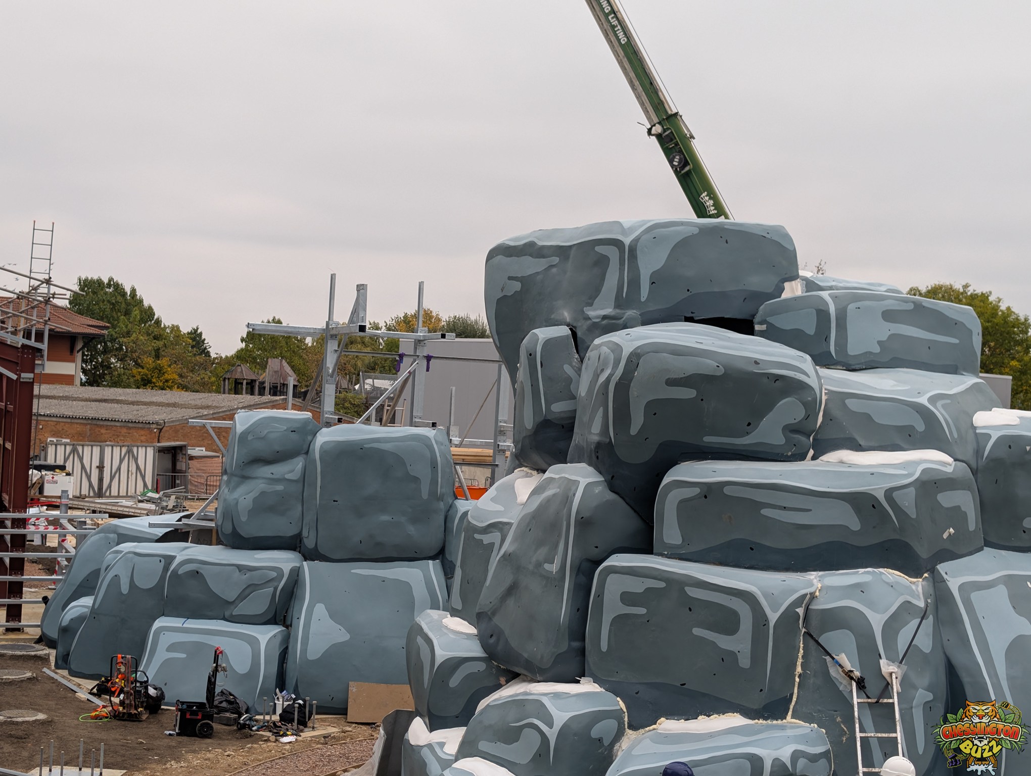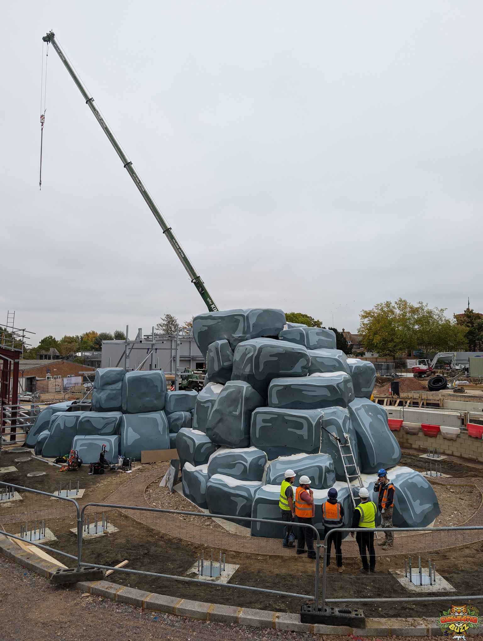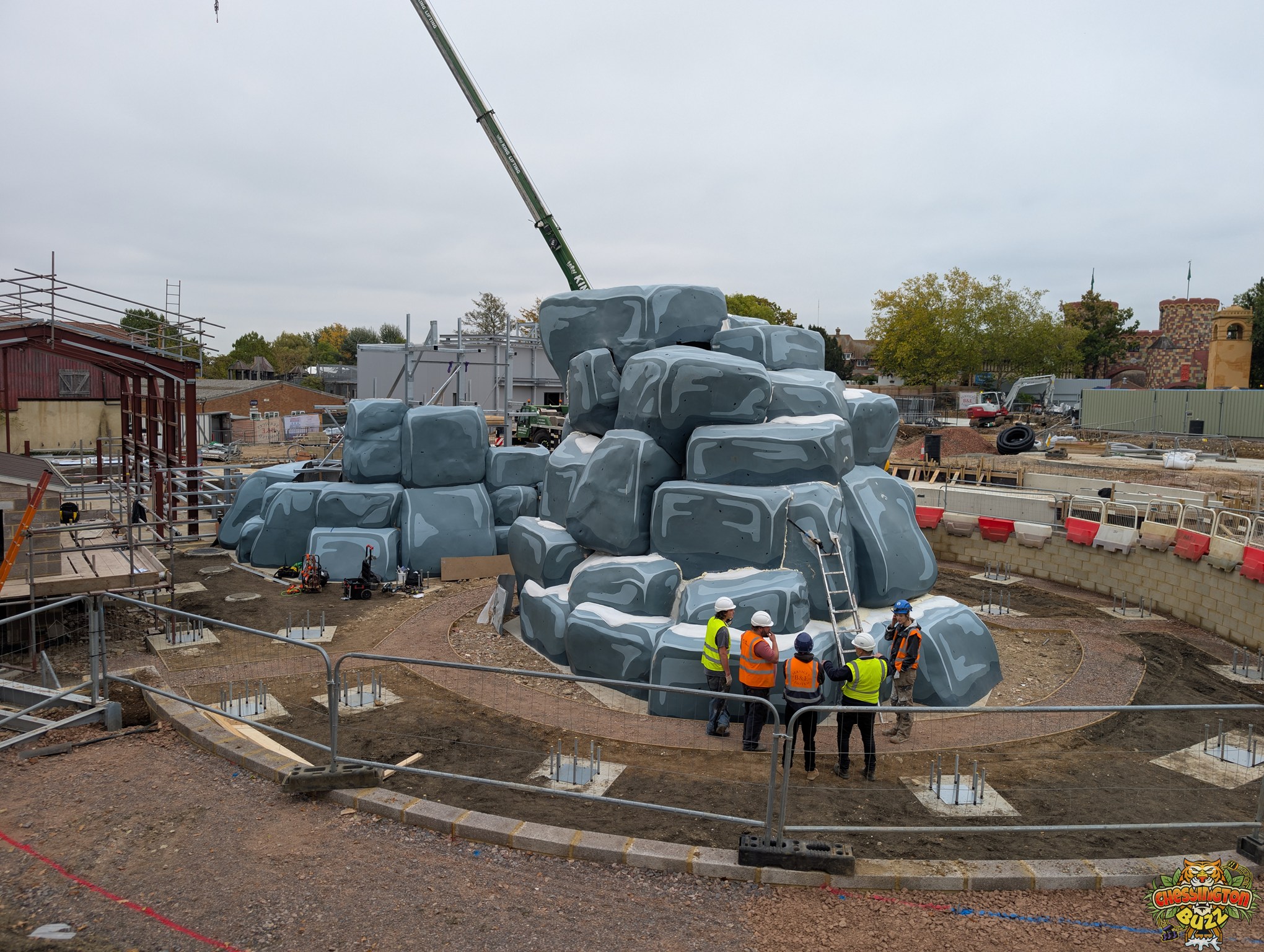 The rockwork is rising and now looks close to full height, giving a real sense of scale on site. Thematic artists are tidying the panels and filling bolt holes, bringing surfaces together cleanly ahead of later finishing stages.