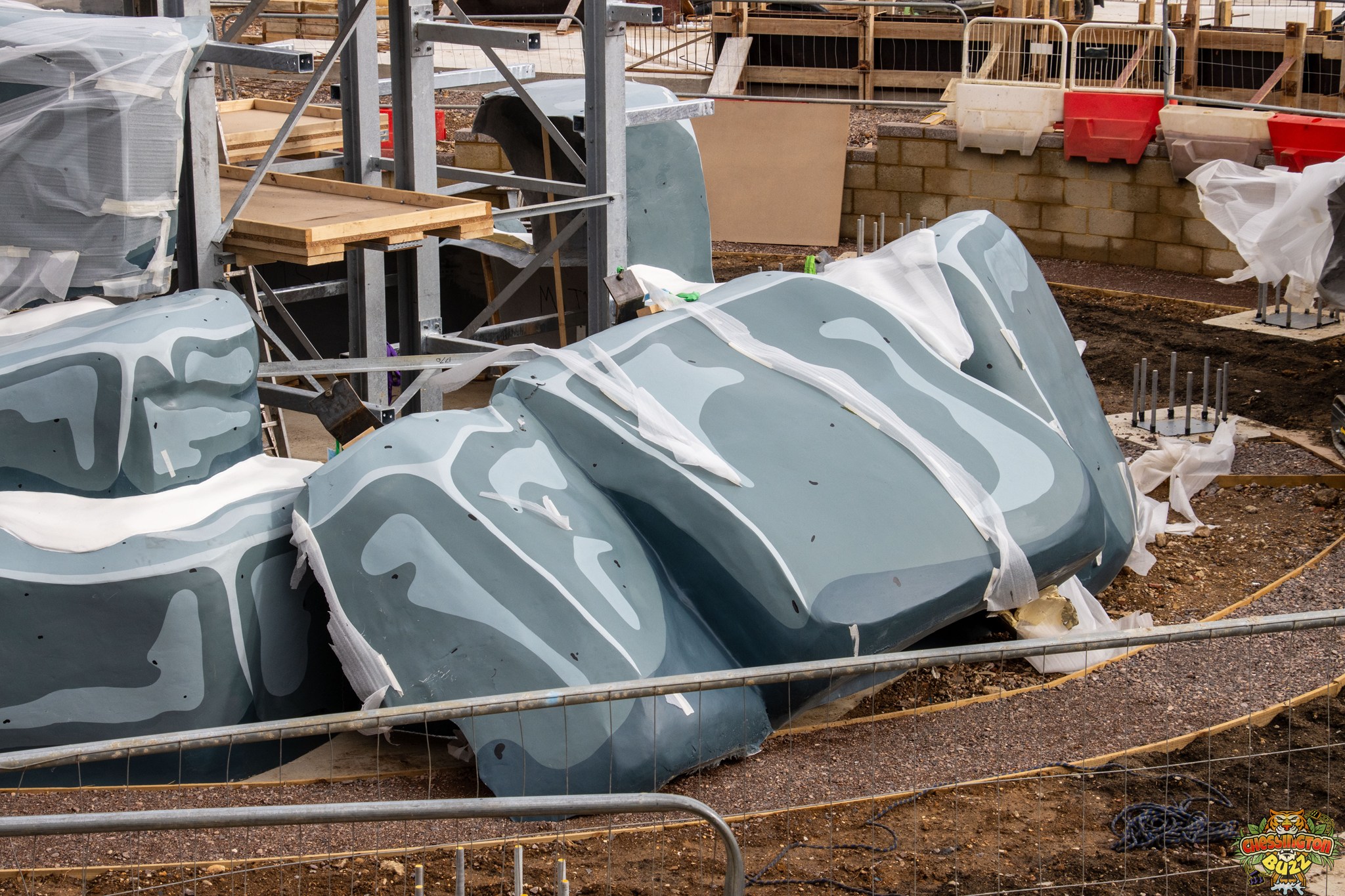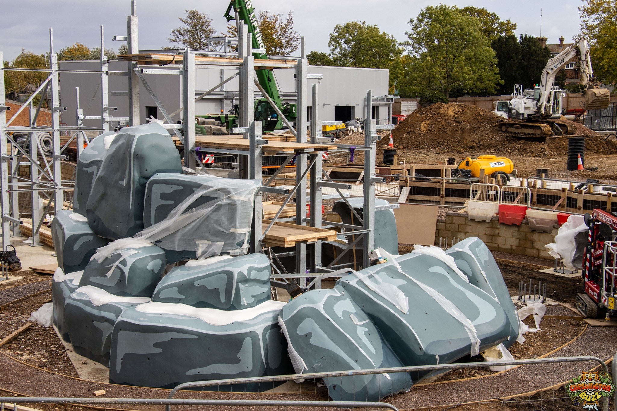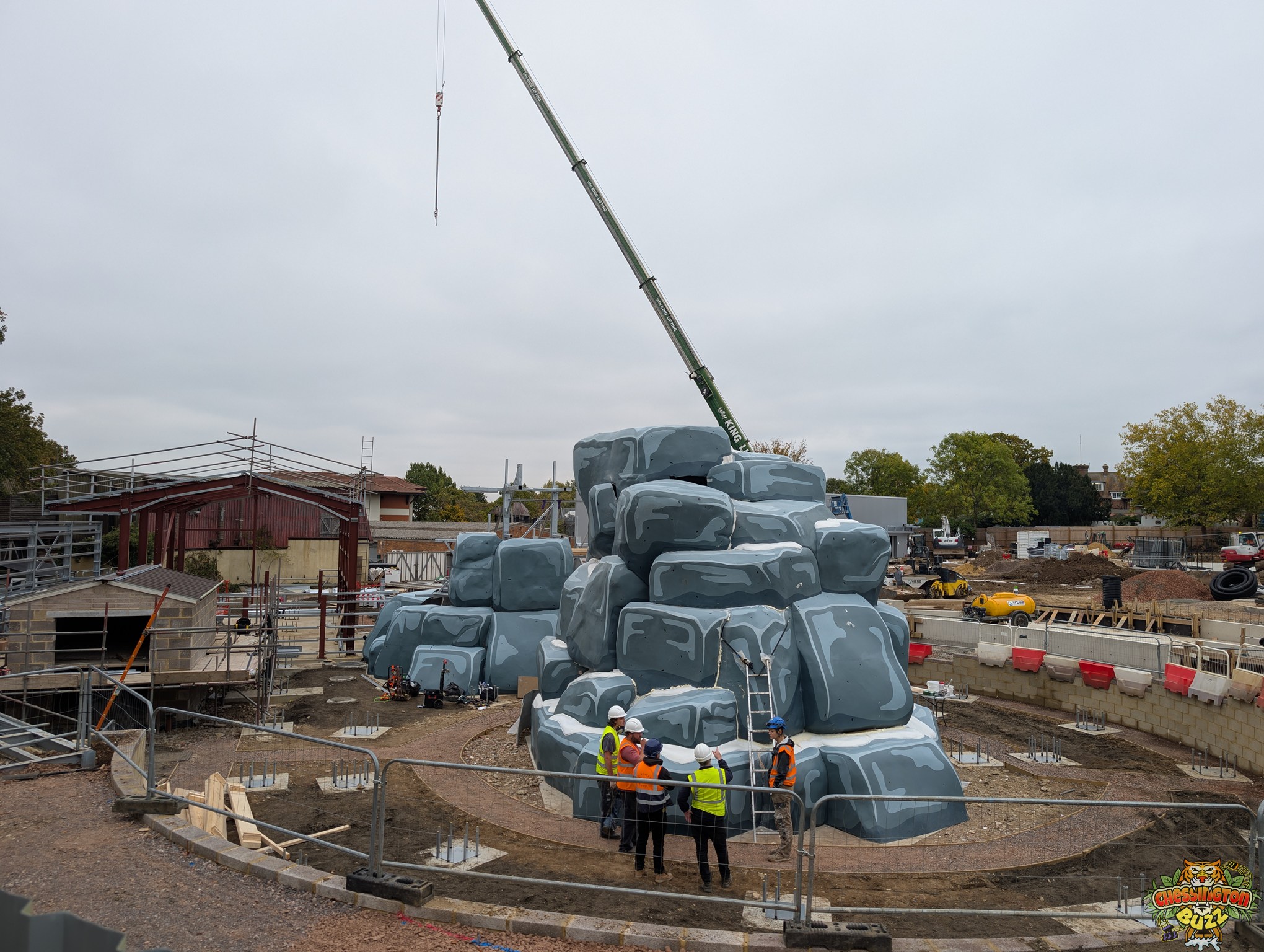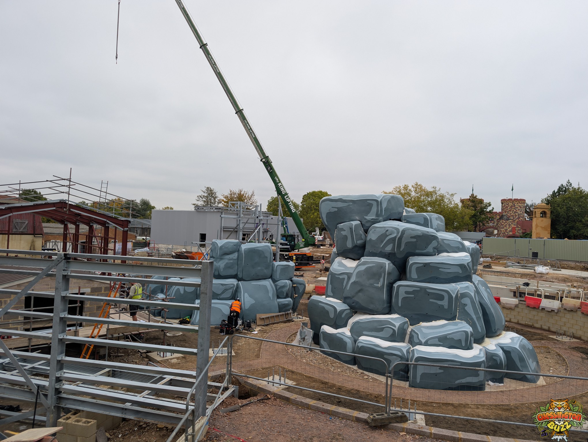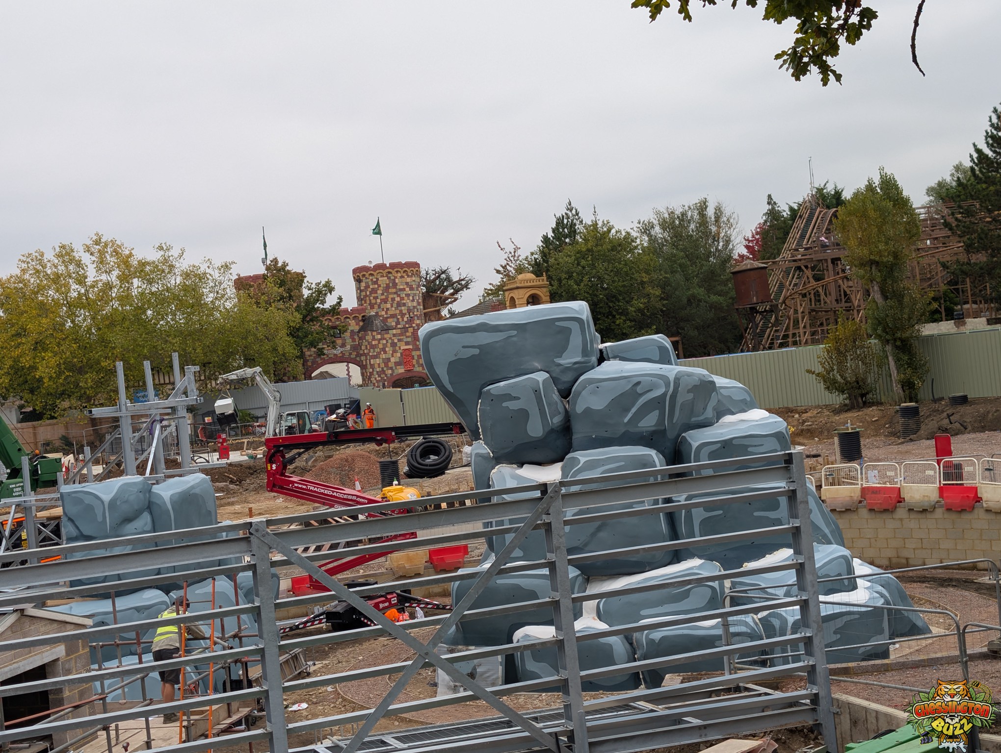 The rockwork is rising and now looks close to full height, giving a real sense of scale on site. Thematic artists are tidying the panels and filling bolt holes, bringing surfaces together cleanly ahead of later finishing stages.