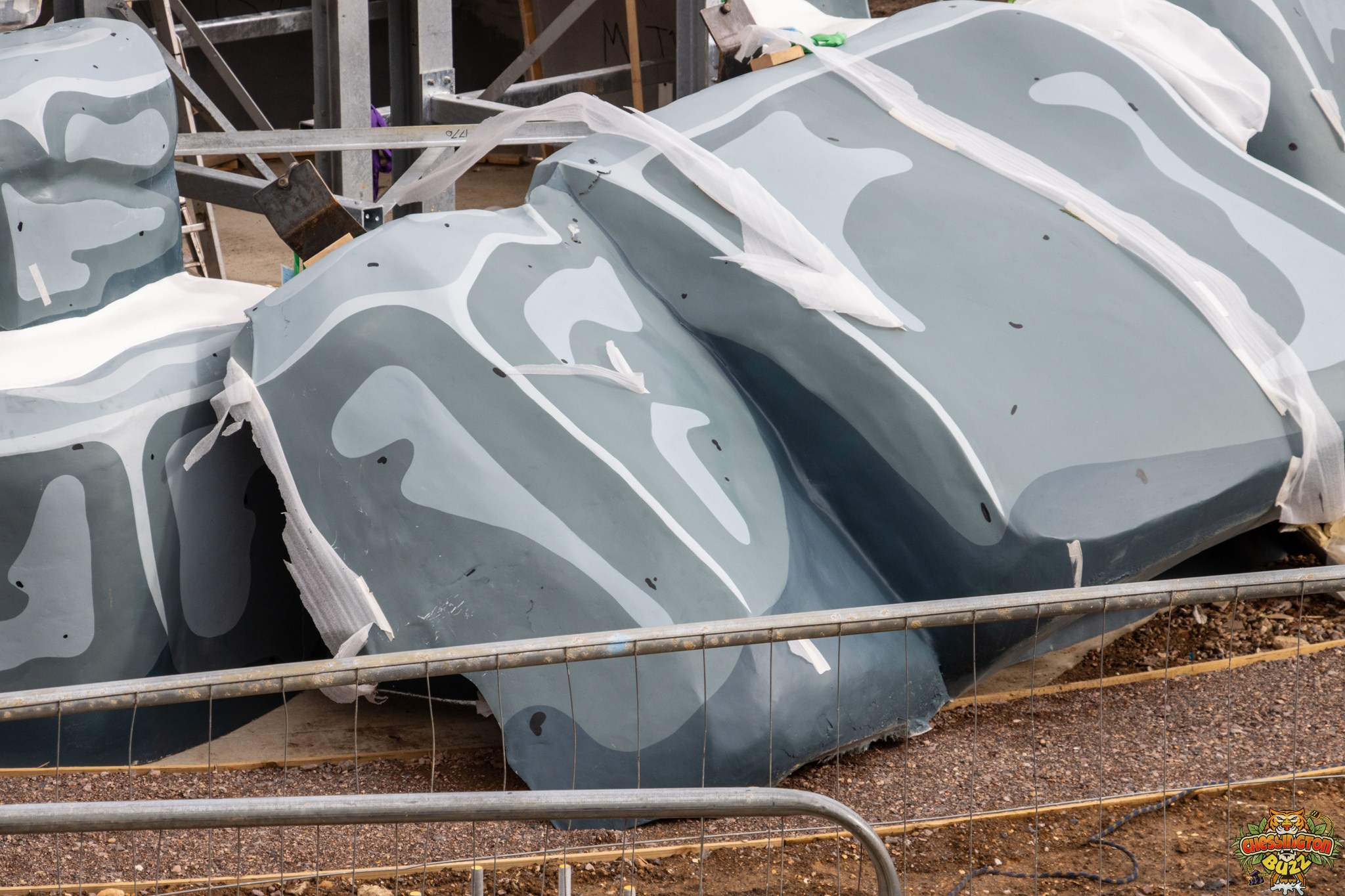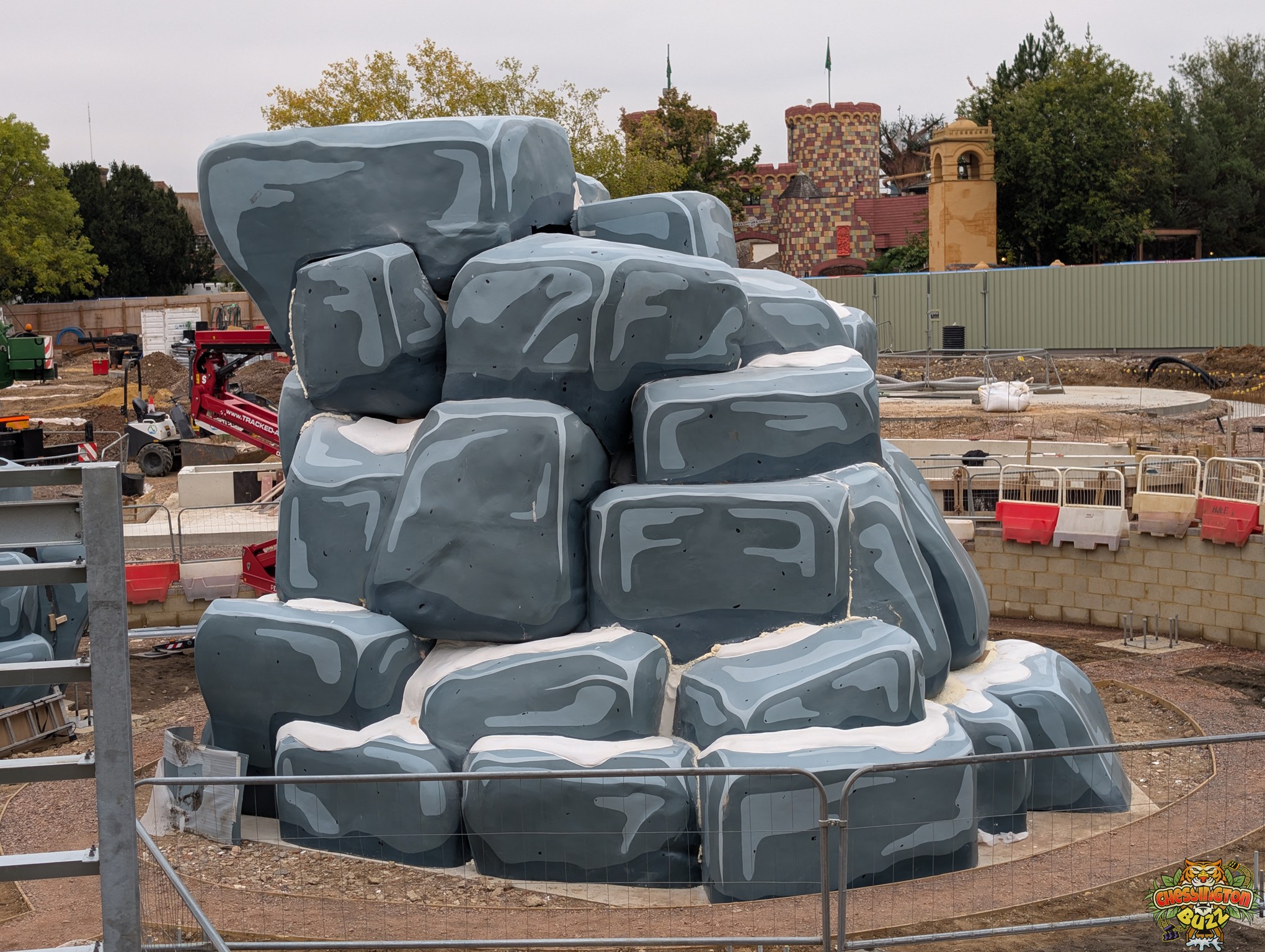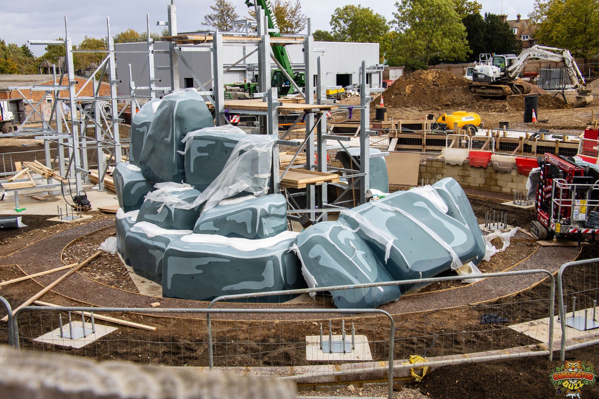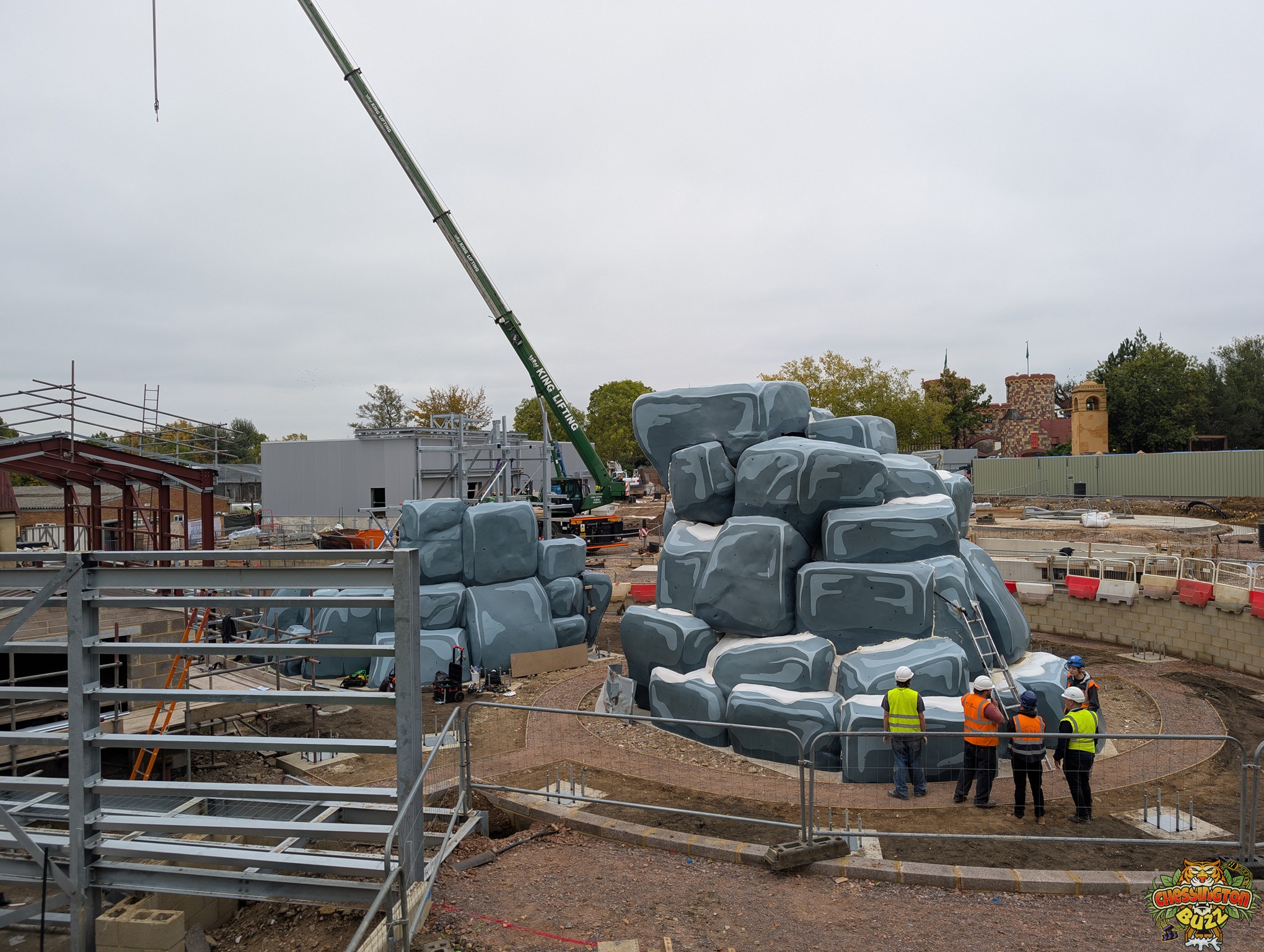 The rockwork is rising and now looks close to full height, giving a real sense of scale on site. Thematic artists are tidying the panels and filling bolt holes, bringing surfaces together cleanly ahead of later finishing stages.