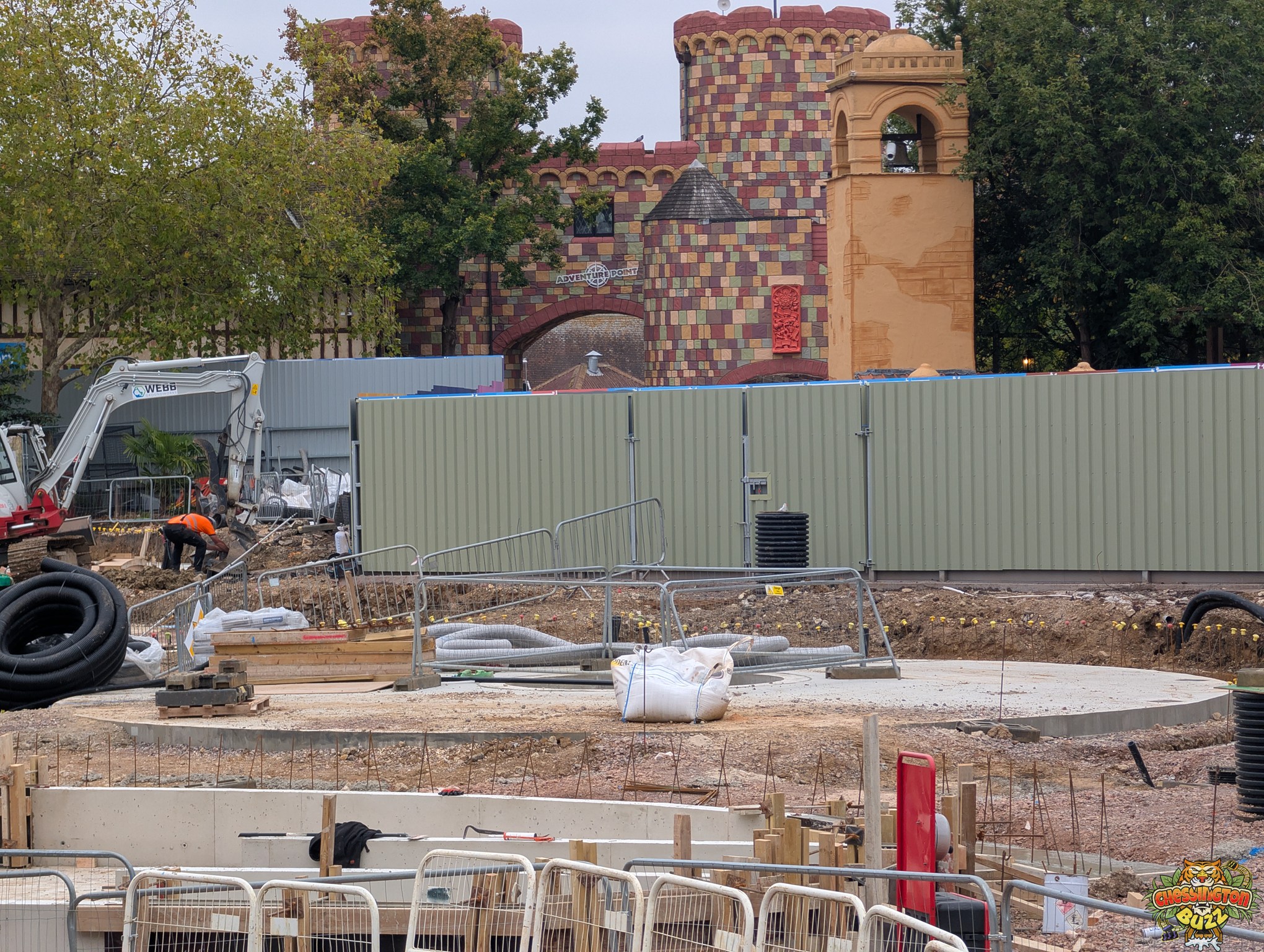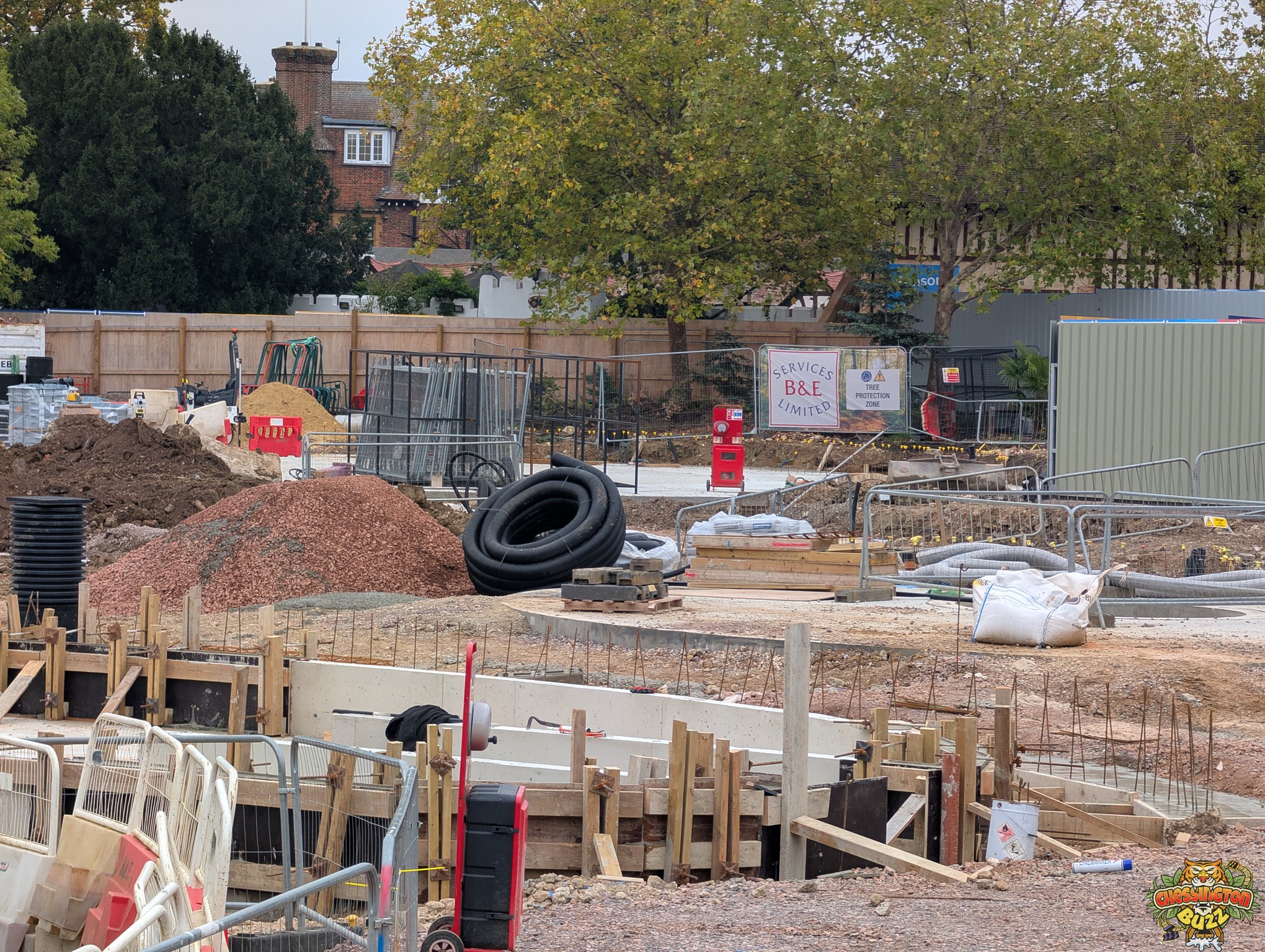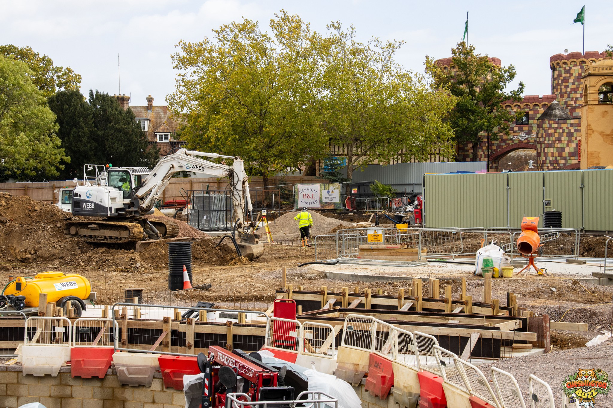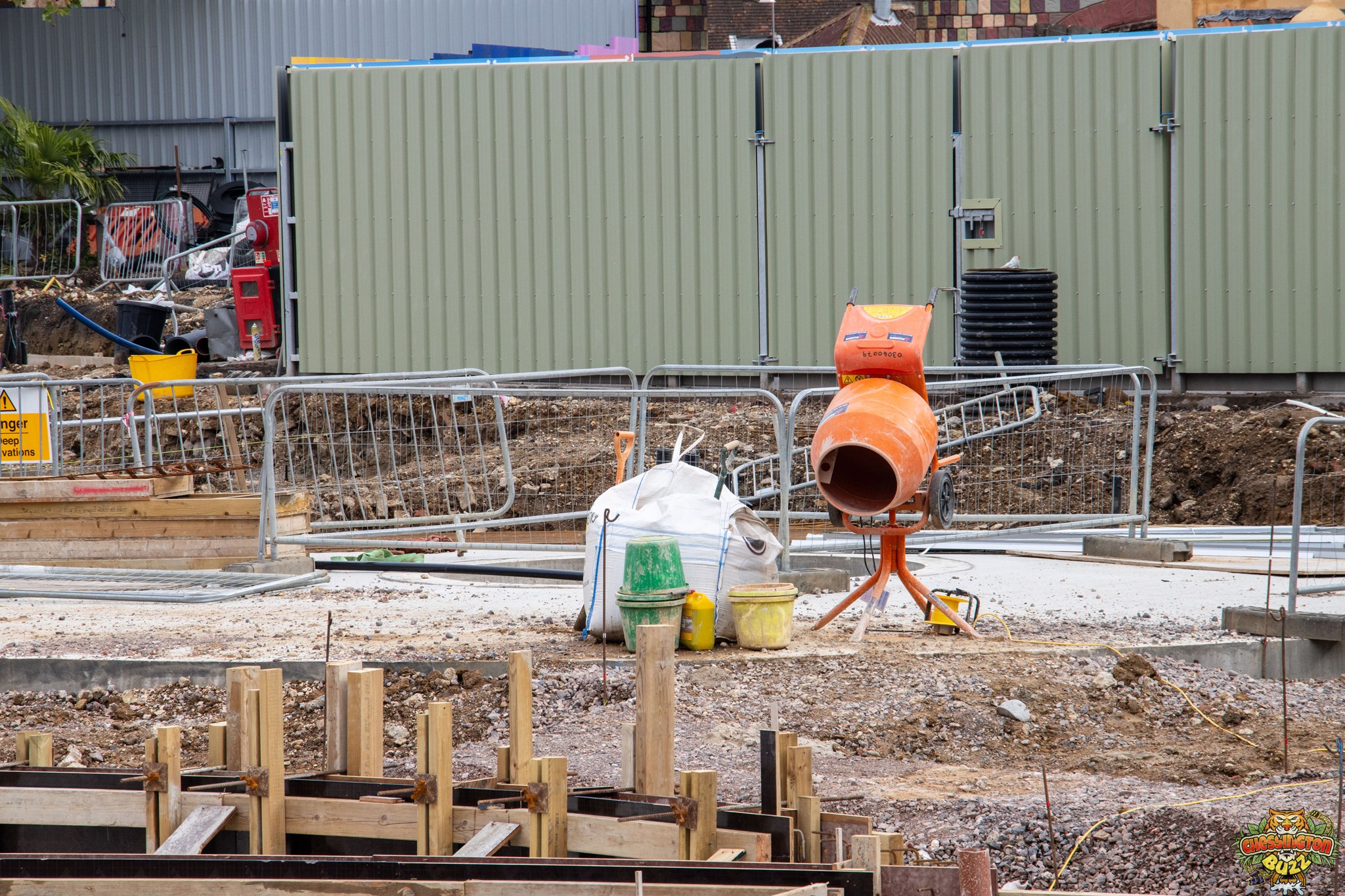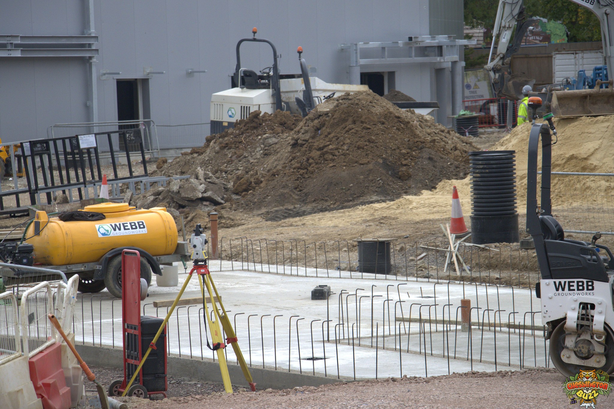 Workers are laying hard standing along the back of the coaster site, likely forming the base for the ride’s queue line and exit pathways. The coaster’s foundations are almost complete, and the retaining wall and internal theming footers are close behind, putting the site on the brink of its next big milestone.