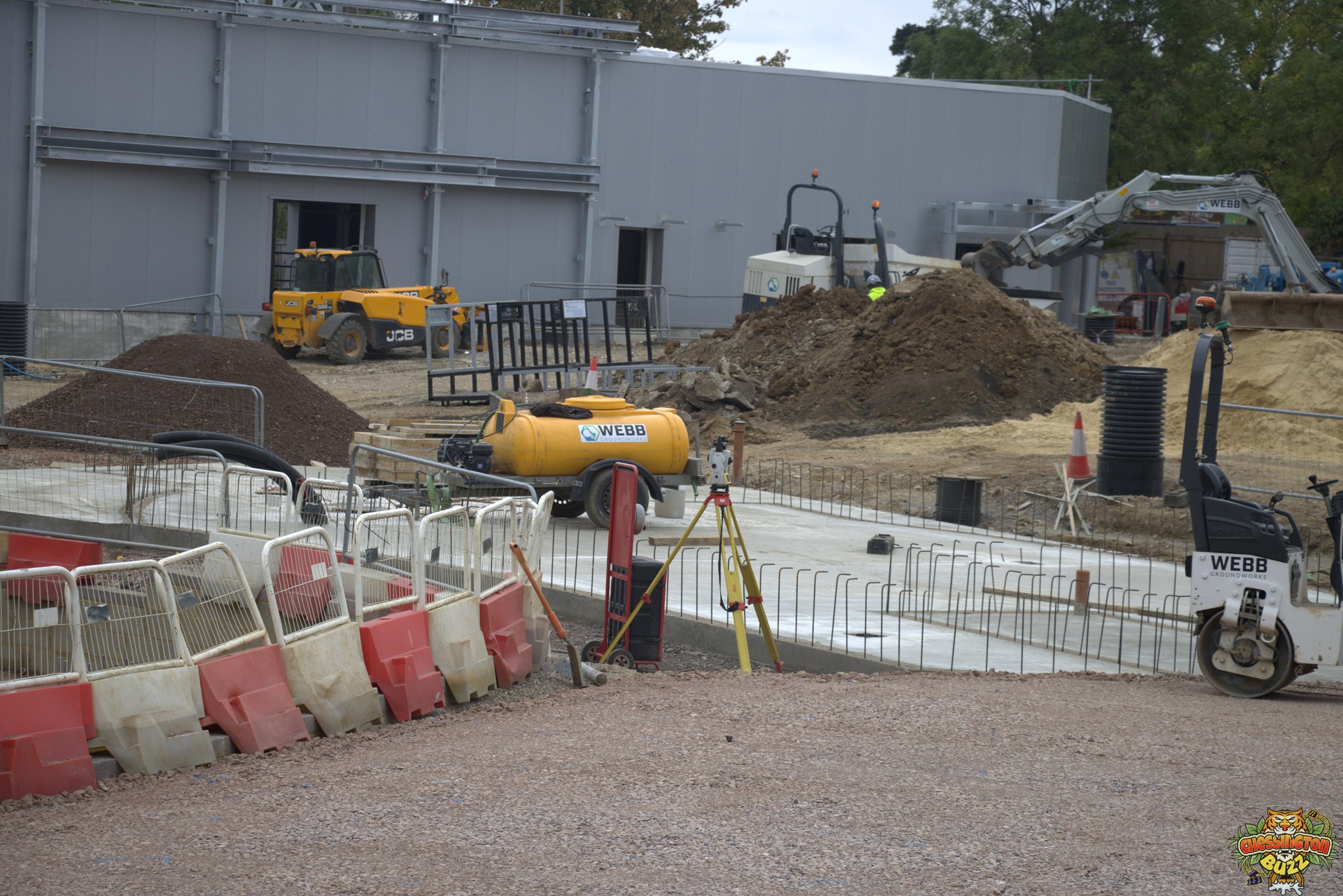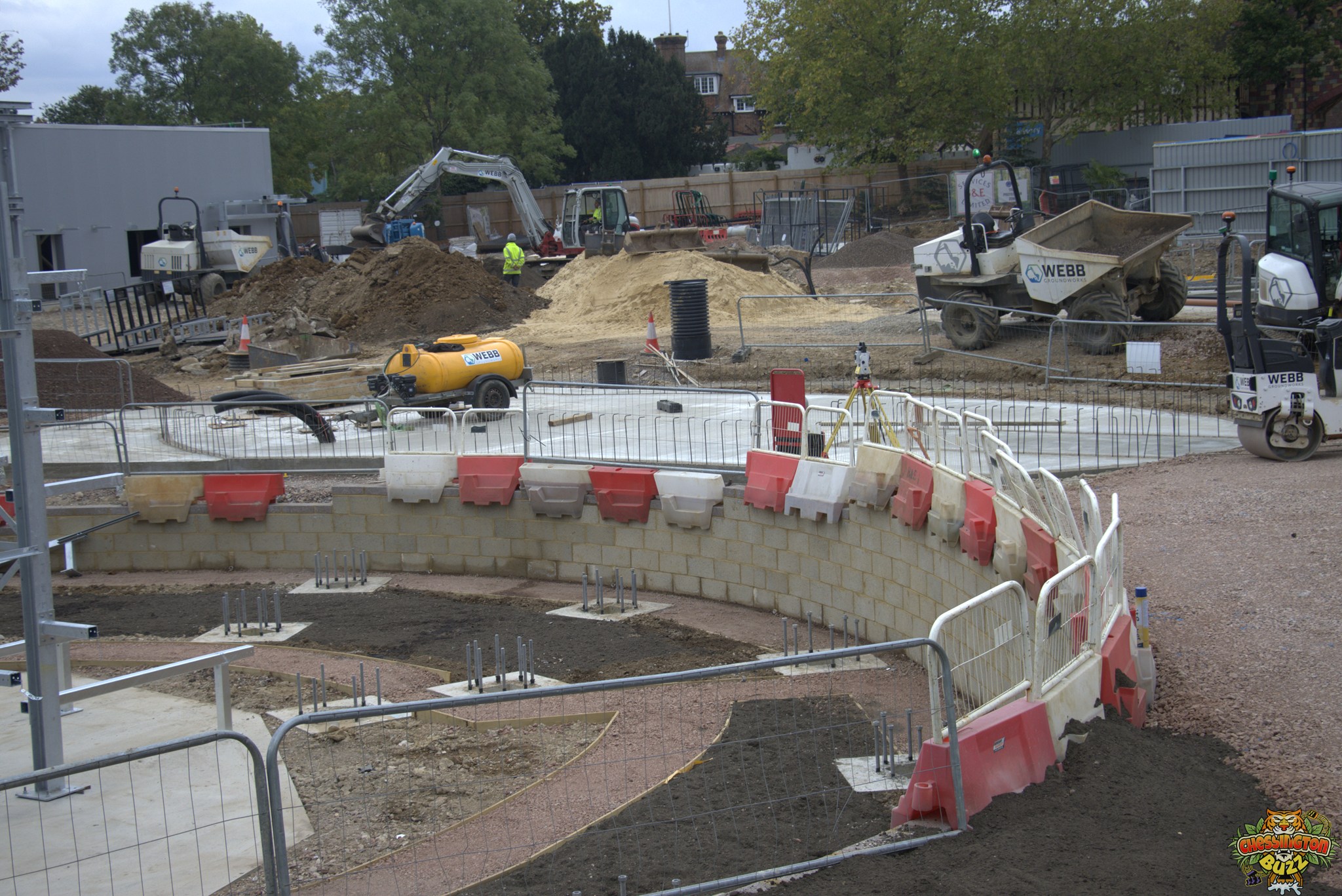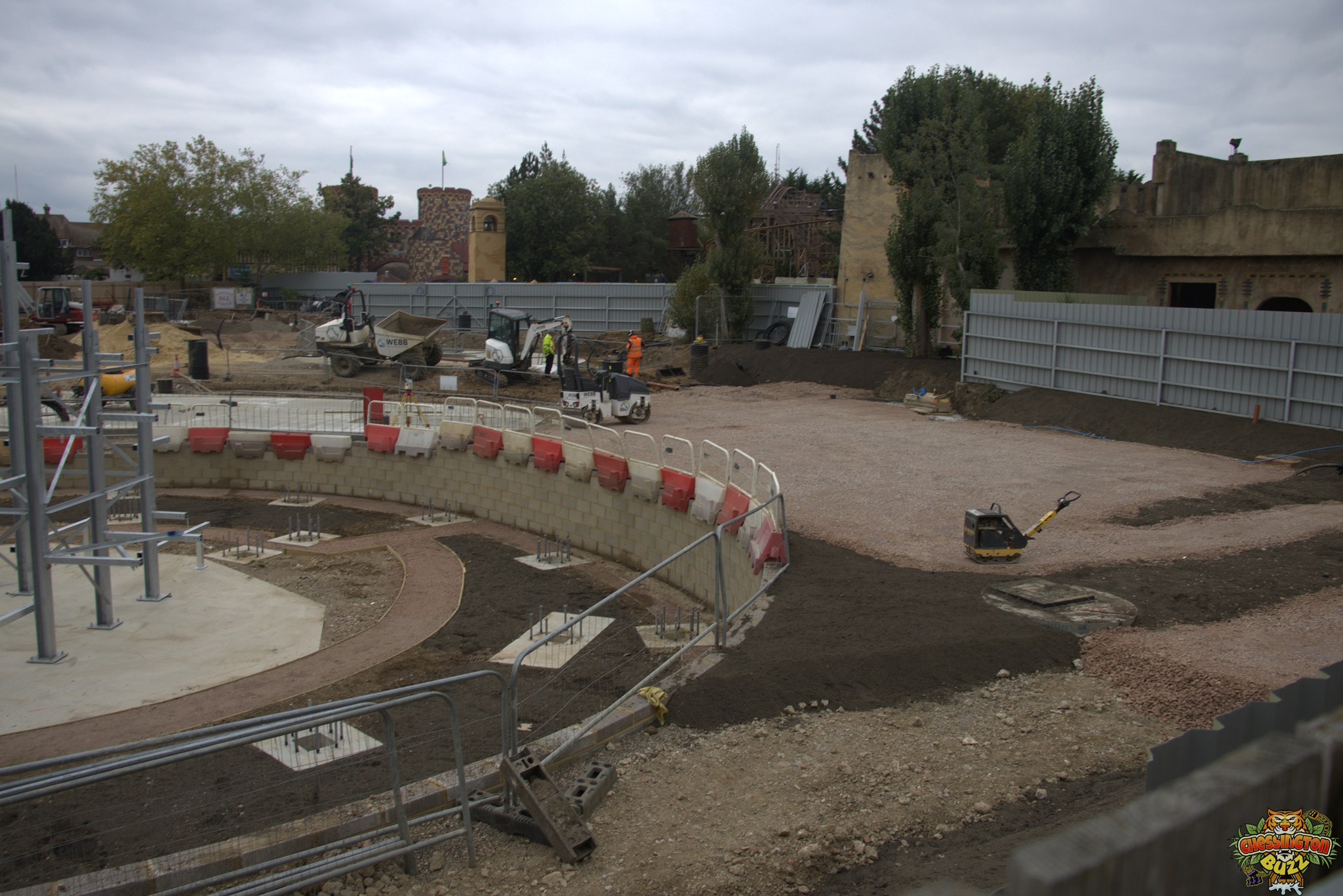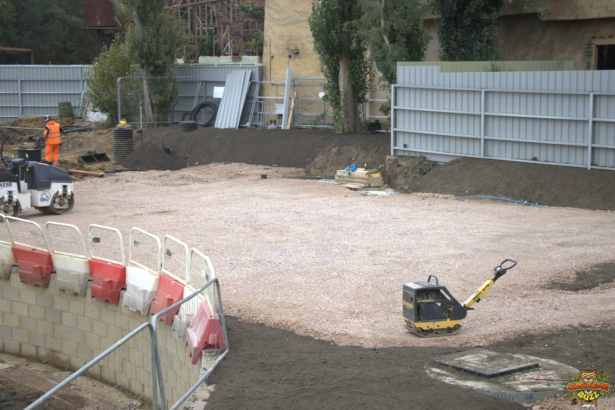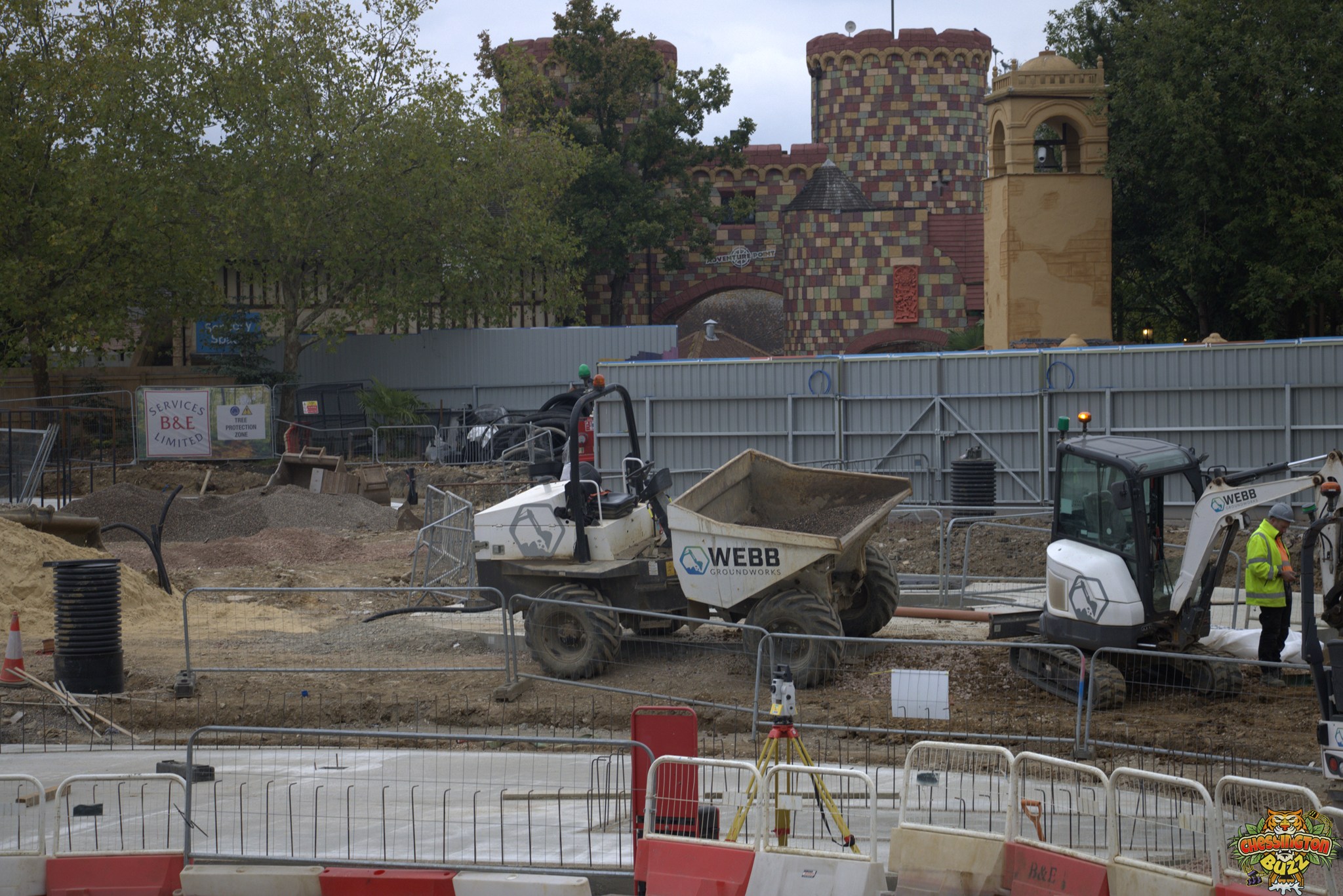 Workers are laying hard standing along the back of the coaster site, likely forming the base for the ride’s queue line and exit pathways. The coaster’s foundations are almost complete, and the retaining wall and internal theming footers are close behind, putting the site on the brink of its next big milestone.