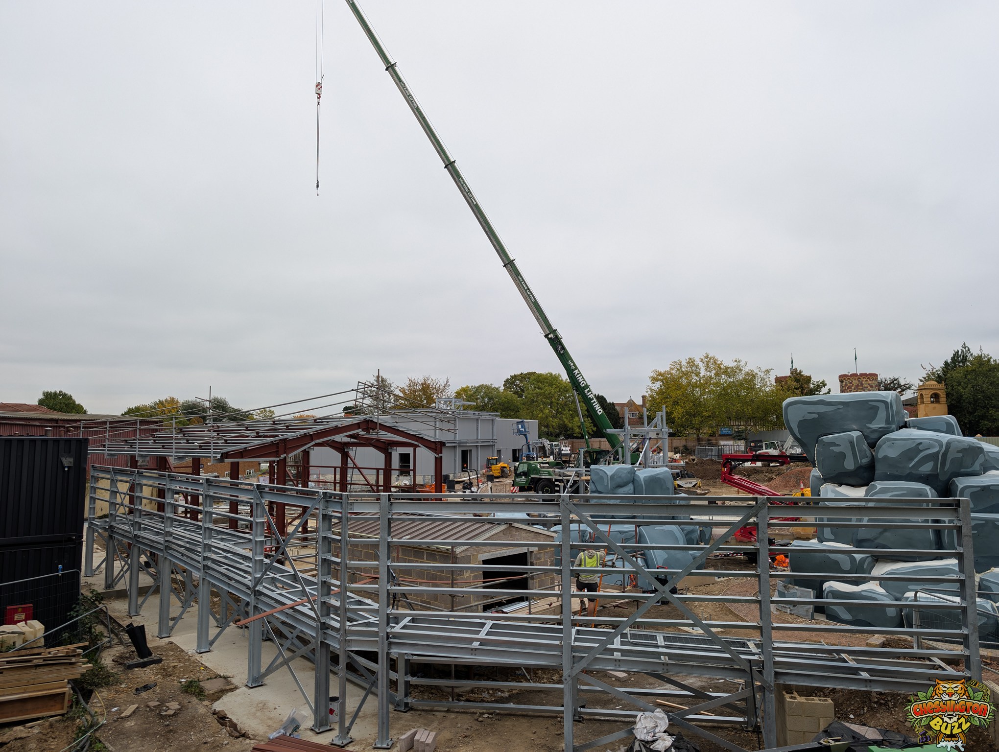 Elsewhere, installation has begun on the elevated queue and exit ramps for the Junior Roller Coaster. These raised pathways will soon guide guests to and from the ride, and their appearance makes the attraction’s layout much clearer to see on site. It’s always exciting when queue-line structures begin to emerge, as they give a real sense of how guests will experience the area once it opens.