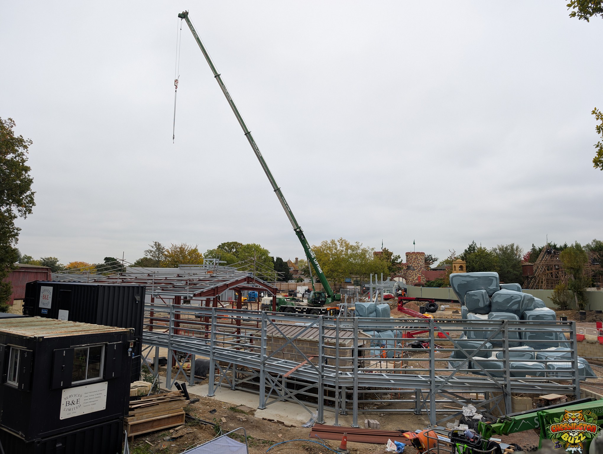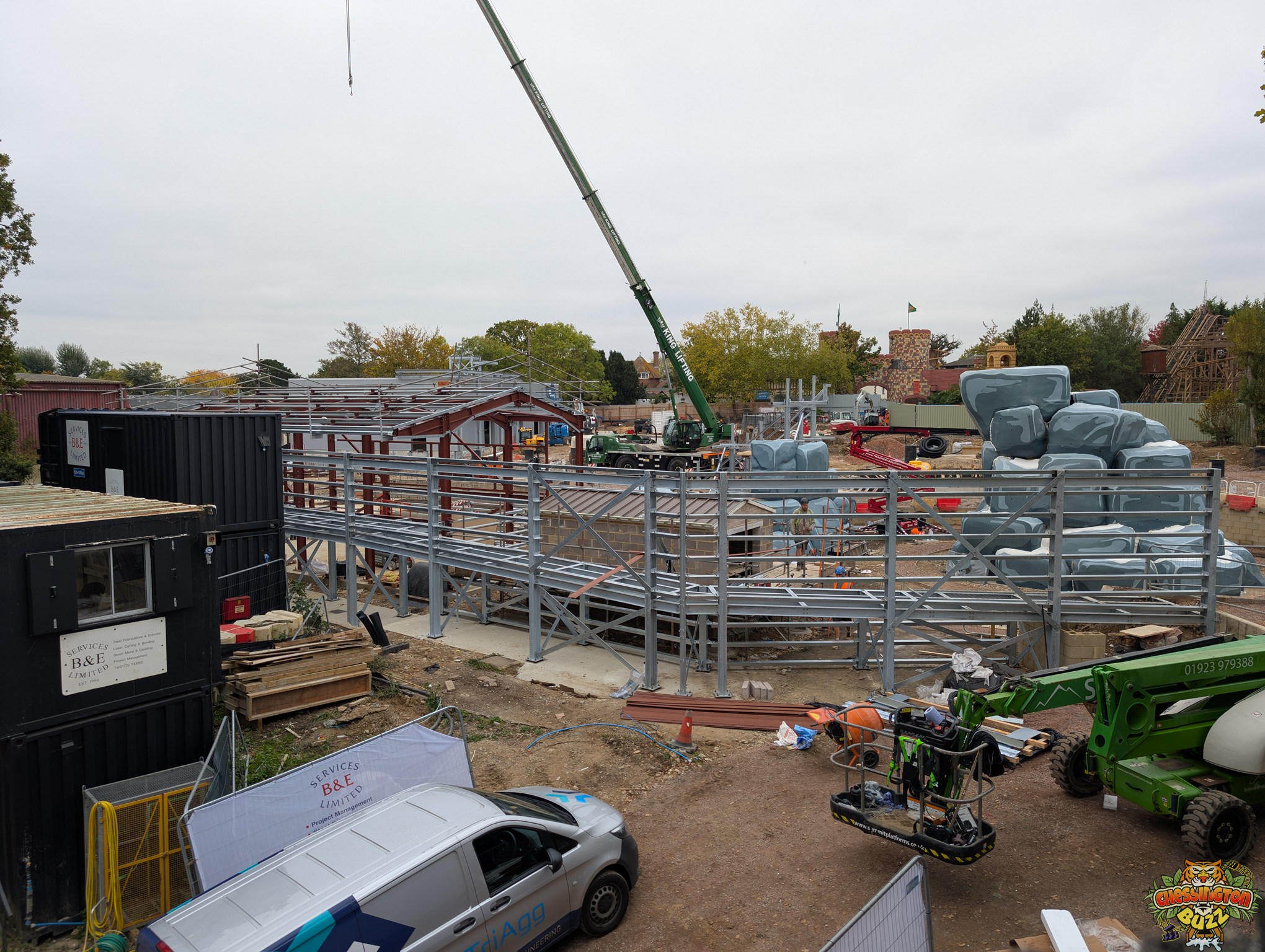 Elsewhere, a crane focused on setting additional steelwork, whilst groundwork around the coaster queue entry building looks close to completion, with preparation wrapping up ahead of forthcoming fit-out.
