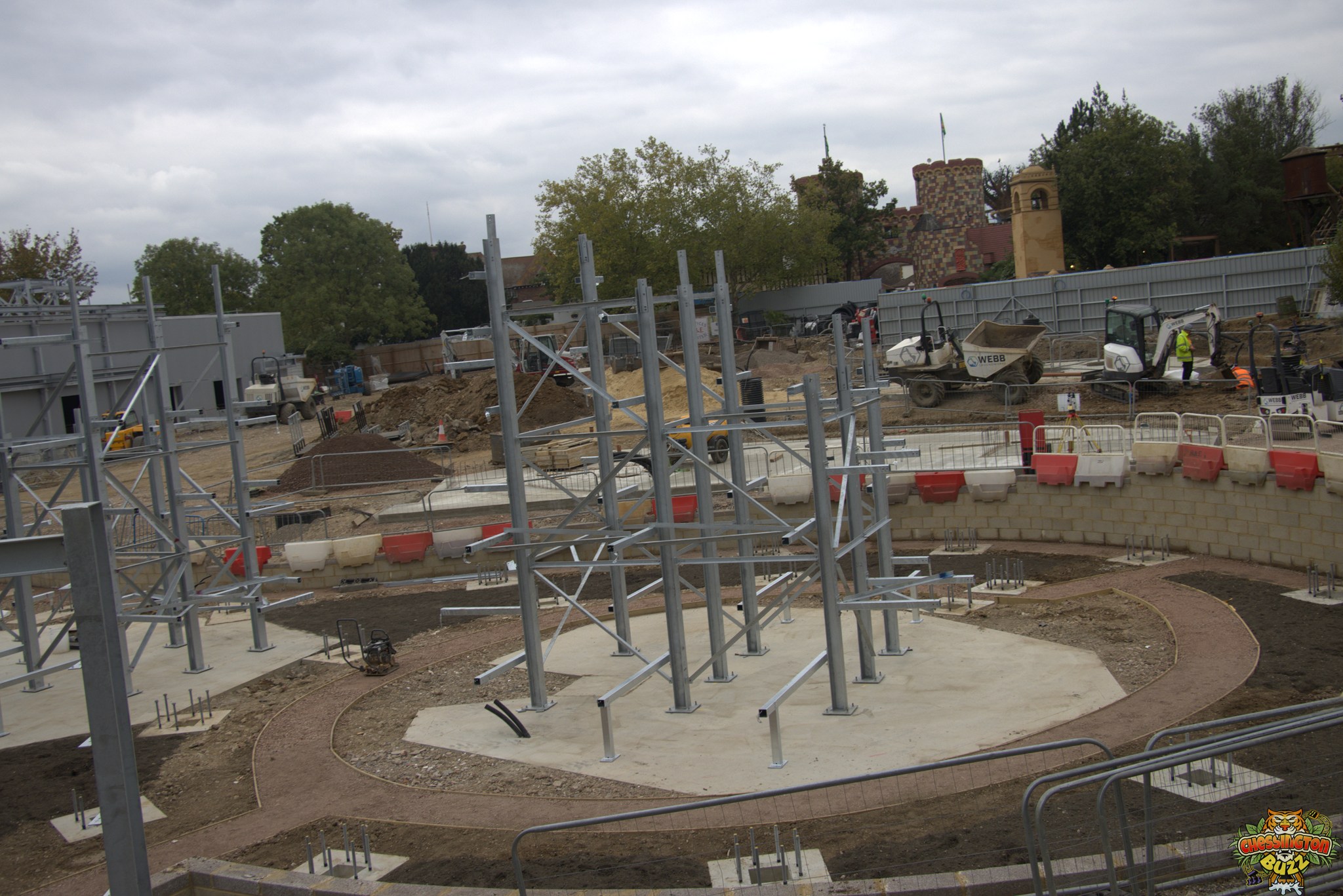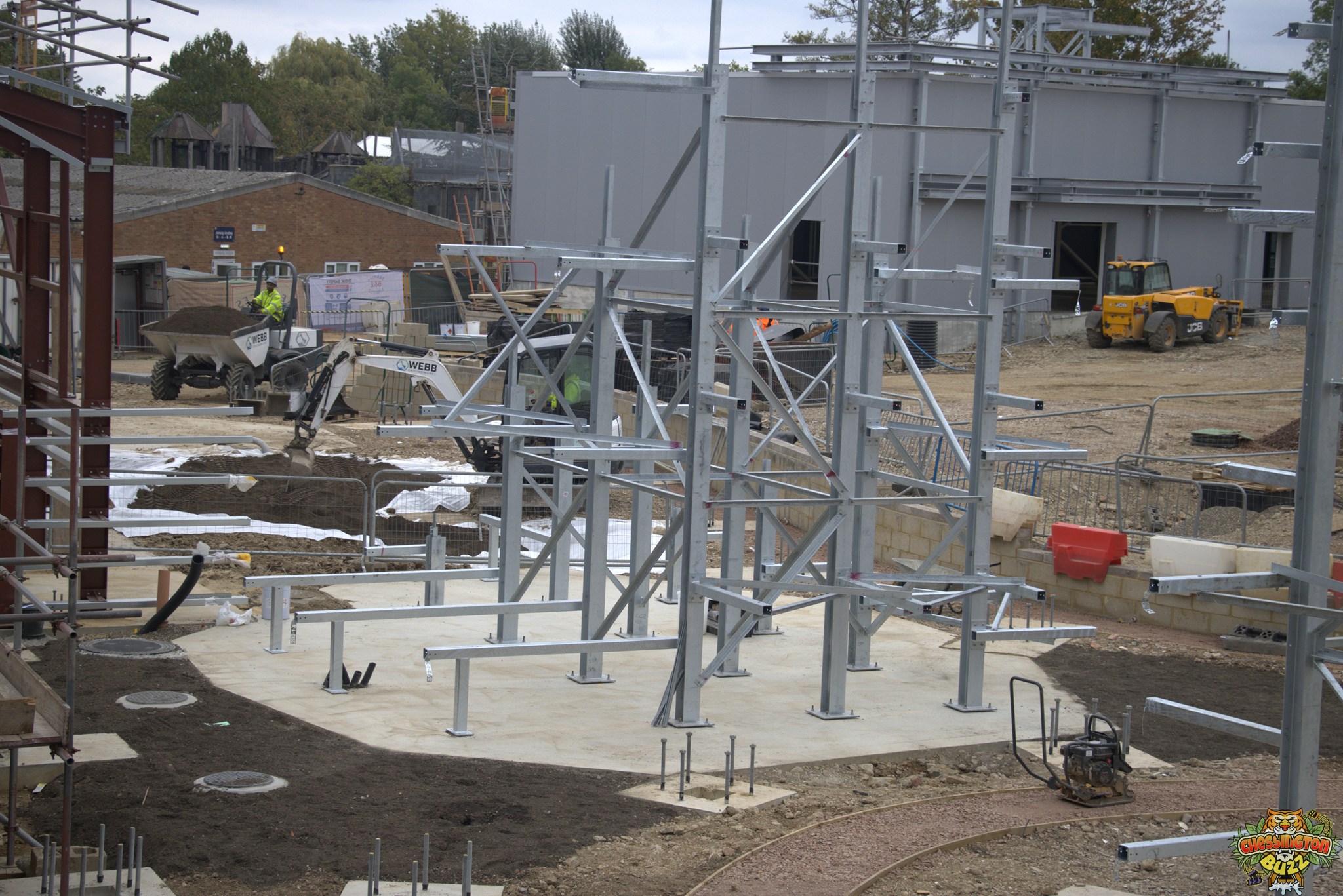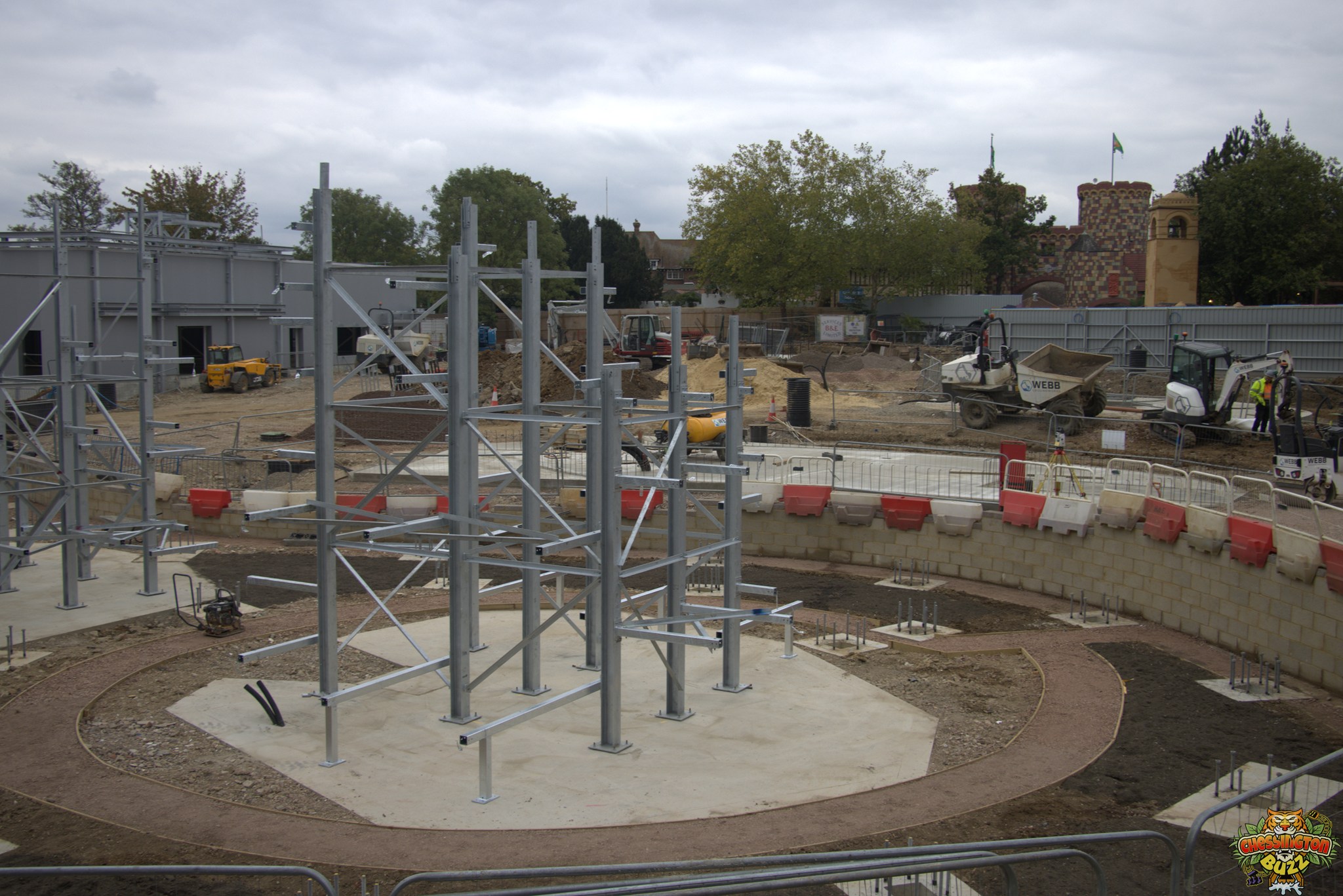 Work progresses well on the ride pads for the flat rides, which look close to complete from available viewpoints today. Theming panels have started to be attached to the steel framework, introducing recognisable forms and adding a touch of colour and tone to the area.