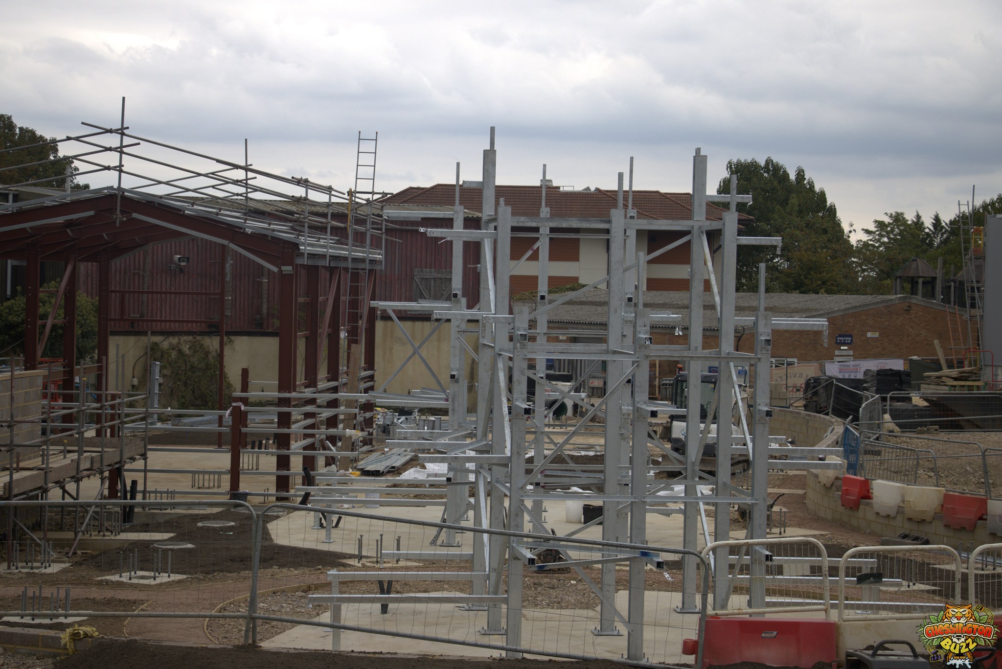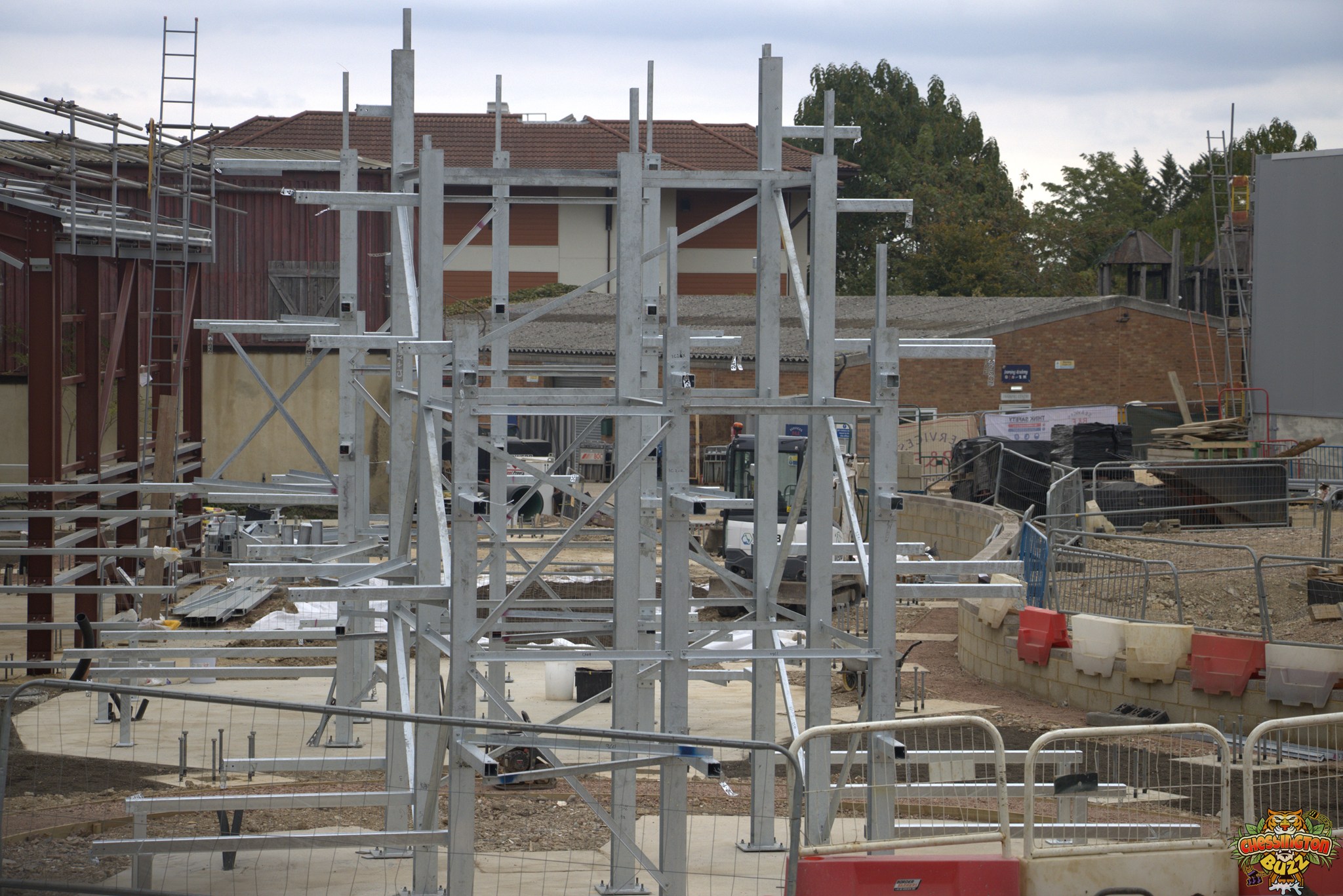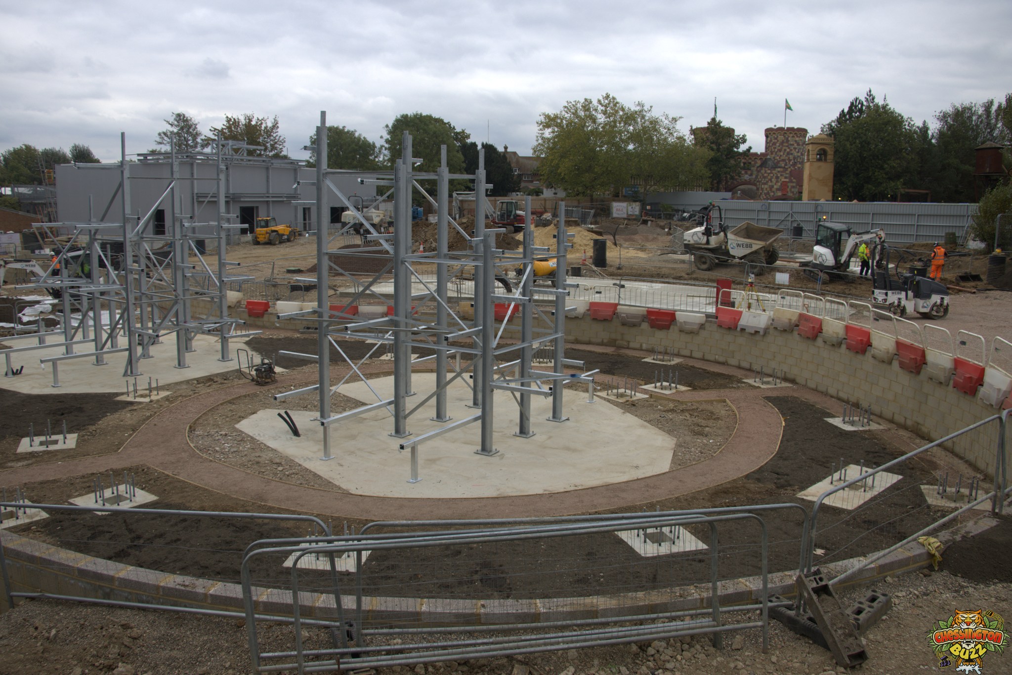 Work progresses well on the ride pads for the flat rides, which look close to complete from available viewpoints today. Theming panels have started to be attached to the steel framework, introducing recognisable forms and adding a touch of colour and tone to the area.
